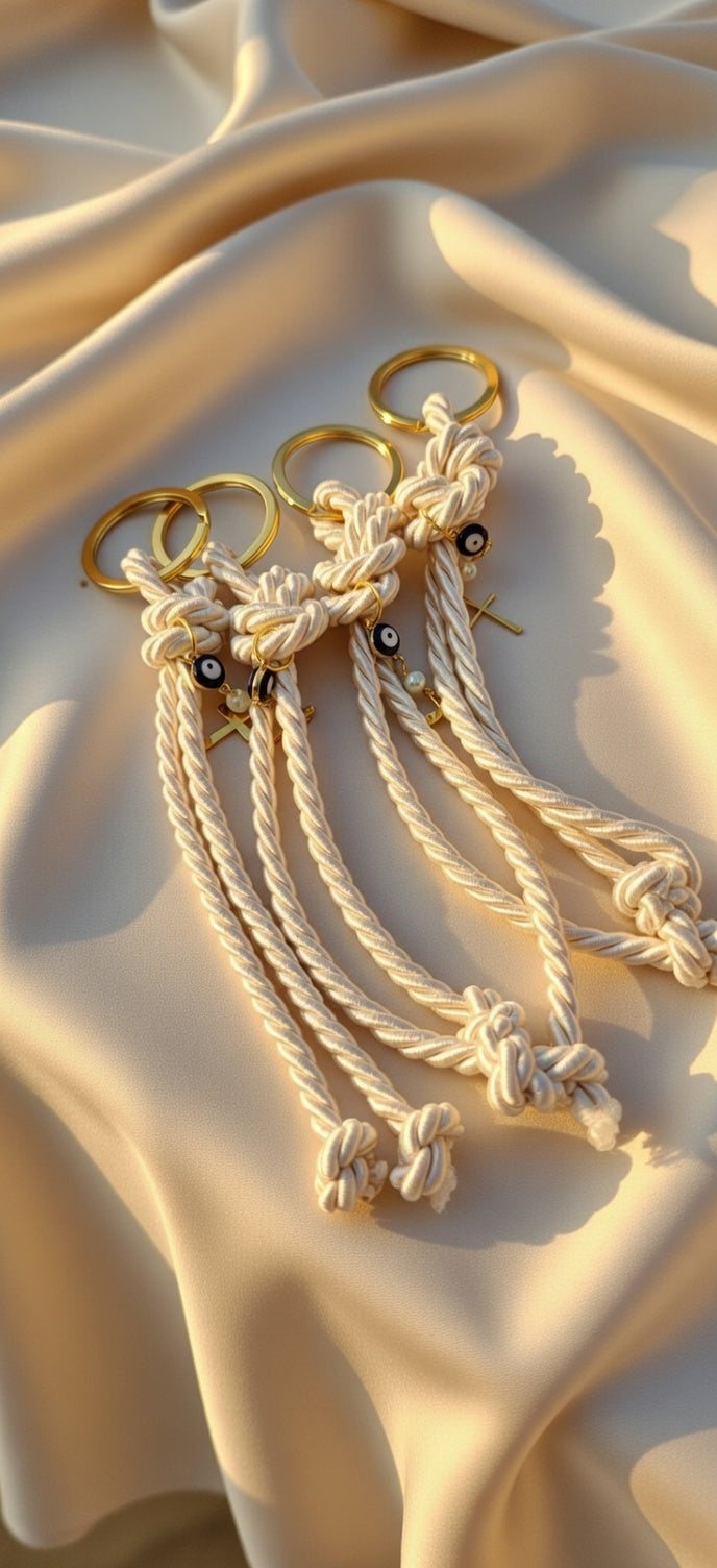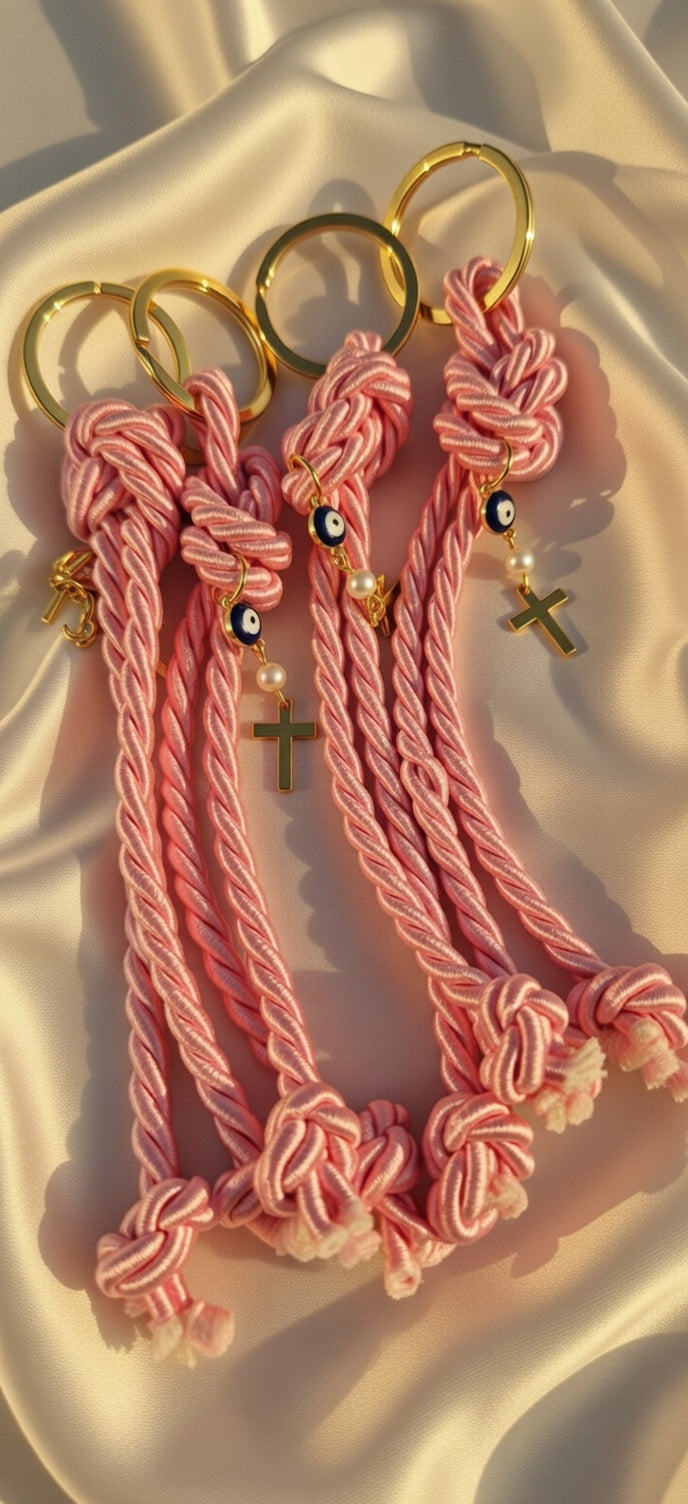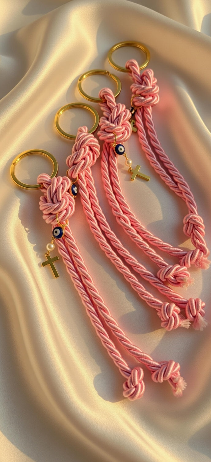 Φτιαγμένο από υψηλής ποιότητας σατέν κορδόνι σε απαλό ροζ χρώμα (dusty pink), πλεγμένο σε περίτεχνους κόμπους που συμβολίζουν την ένωση και την προστασία.