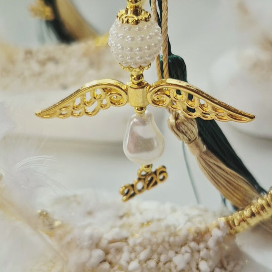 Το χρυσό αγγελάκι είναι διακοσμημένο με περλέ χάντρα, ενώ τοποθετείται μέσα σε έναν χρυσό κύκλο. Η σύνθεση αγκαλιάζεται από λευκό φτερό και στηρίζεται πάνω σε λείο, λευκό βότσαλο με λεπτή χρυσόσκονη. Μια κομψή χειροποίητη δημιουργία που φωτίζει κάθε χώρο.💝