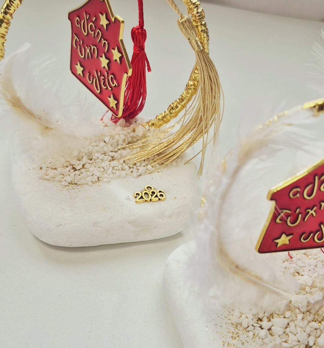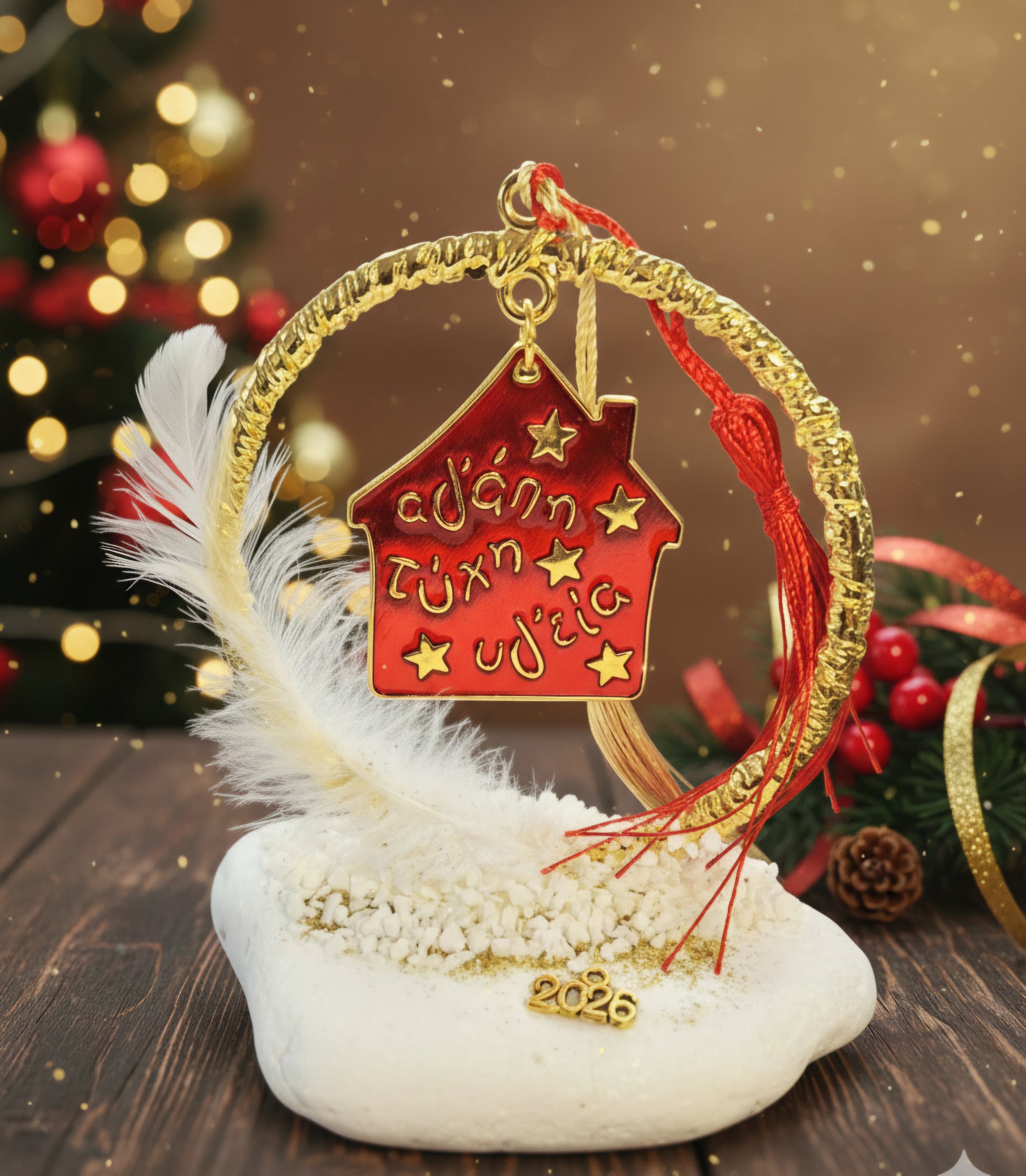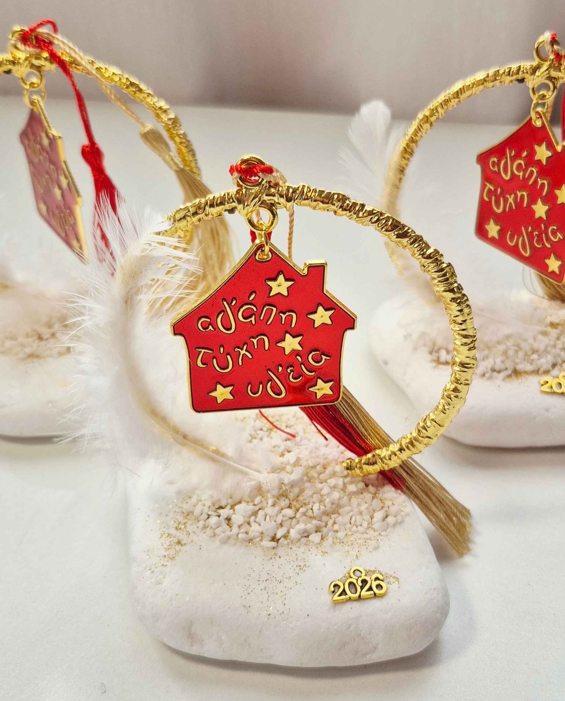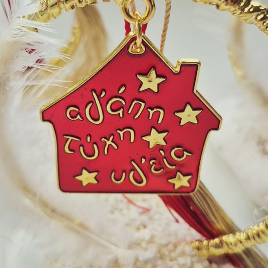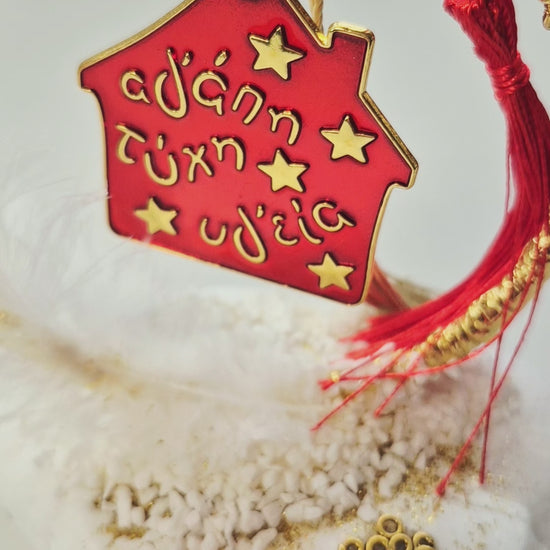 Το μεταλλικό στεφάνι σε κόκκινο και χρυσό αγκαλιάζει το σπιτάκι με τις ευχές «Αγάπη, Τύχη, Υγεία», ενώ η εντυπωσιακή φούντα προσθέτει μια elegant πινελιά.💫